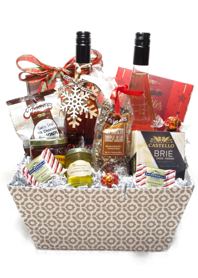 Includes our Honey Crisp & Apple Cranberry wines, chocolate truffles, chocolate cashew buttercrunch, chocolate almonds, individual chocolates, brie cheese, red pepper jelly, honey, crackers and snowflake ornament. All wrapped up in a beautiful fabric lined basket.